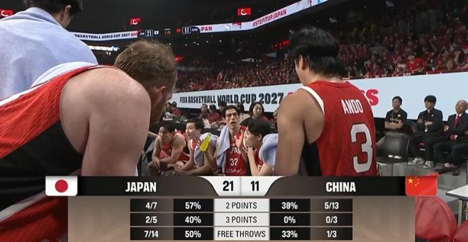 中国男篮首节只有16中5的准星,其中三分3中0与罚球3中1,胡金秋与廖三宁分别得到4分,全队累计9次犯规与3次失误。