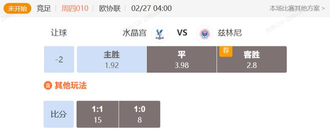 水晶宫上周末联赛踢垫底的狼队都显得十分吃力,在对手射失点球并且罚下一人,才勉强绝杀对手。主帅格拉斯纳现在依然处于身在曹营心在汉的局面,既然老板不肯付违约金,那就继续摆烂到赛季结束走人。对于今天的欧战,水晶宫只要赢球就能晋级,本身就缺乏大胜的欲望。从近期的比赛来看,水晶宫主帅格拉斯纳依然是把换人次数控制在场均3个以下,来抗议老板不断卖人造成的阵容实力下降。